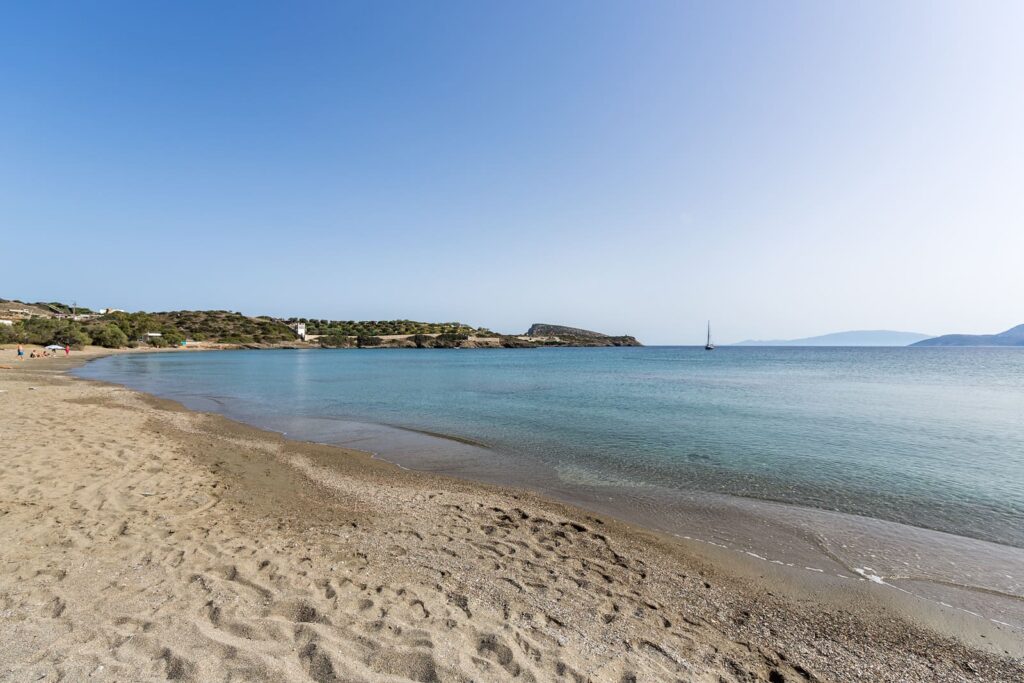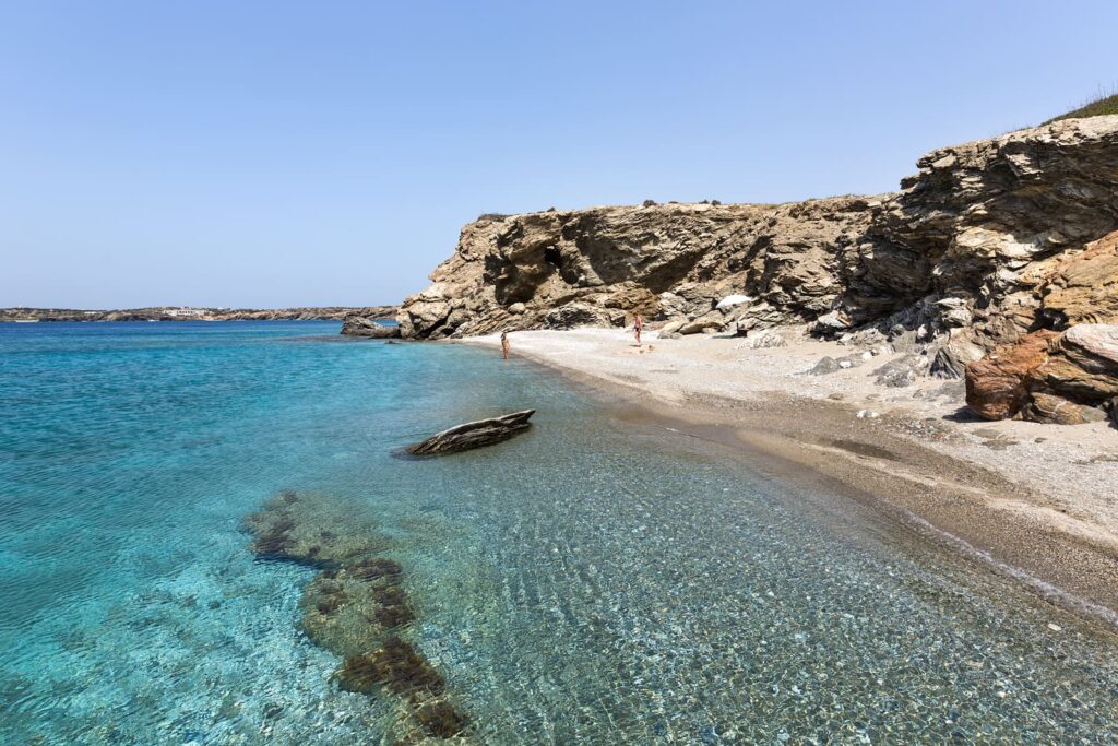 Almyros is a quiet, relatively long beach with fine sand and shallow, turquoise waters on the northeast side of the island. Here, you’ll find some tamarisk trees for shade.