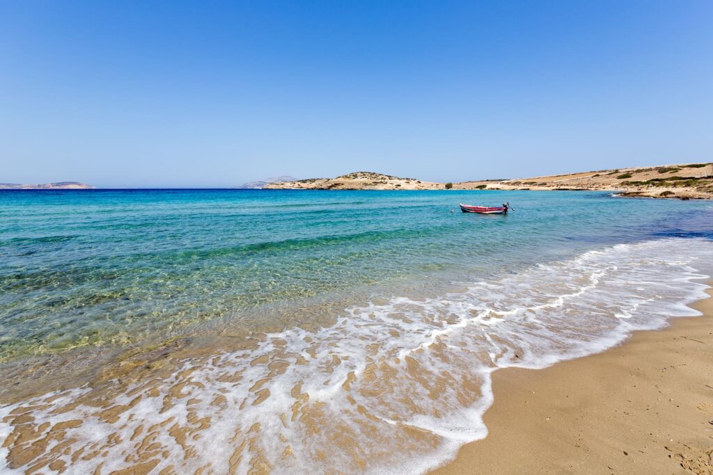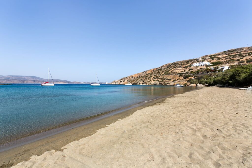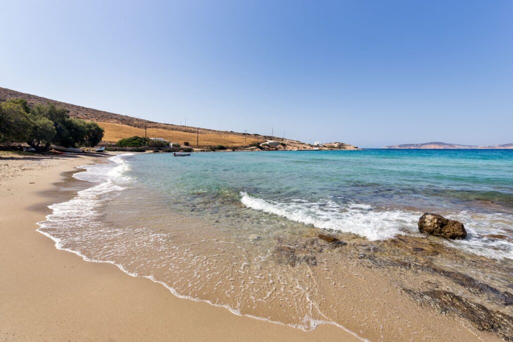 To get to Livadi Beach on foot, follow an easy 20-minute trail that starts from Chora, the island’s capital.
